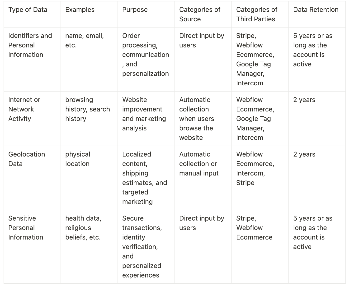 For online purchases, your payment details are processed by third-party payment processors like Webflow Ecommerce and Stripe. While we may see the last four digits of your card, we do not store your full payment information. You can review Webflow Ecommerce and Stripe's privacy policies at https://webflow.com/legal/privacy and https://stripe.com/privacy.